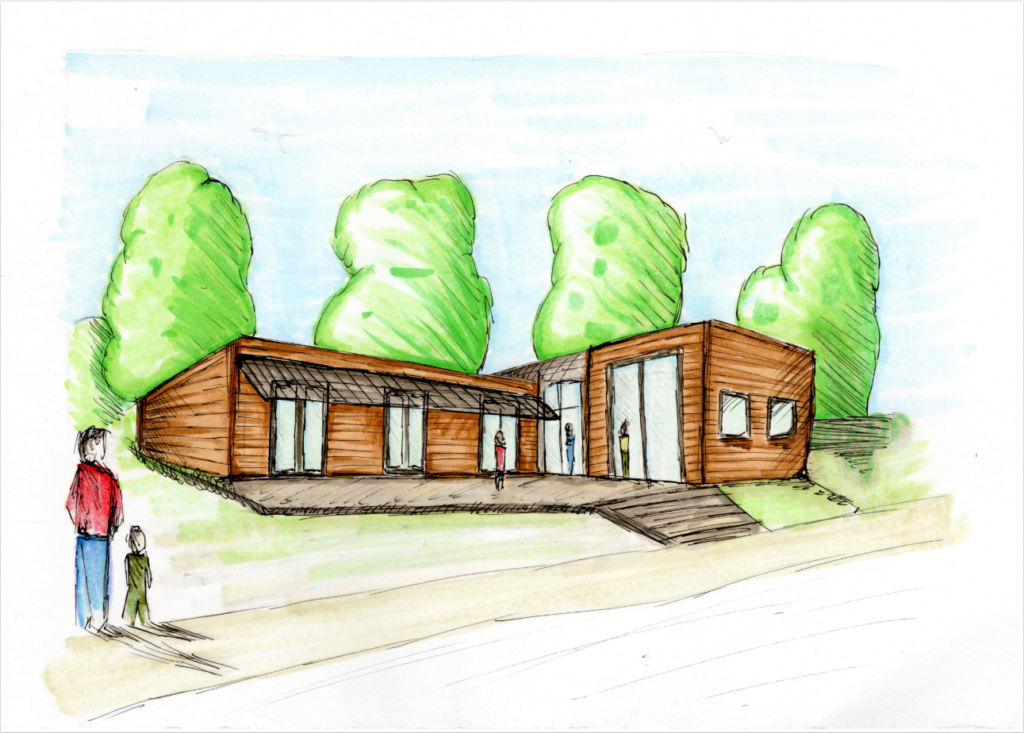 Das alte Holzblockhaus, weicht dem Neubau in Holzoptik. Dort befinden sich verschiedene Räume für unsere Gäste sowie Büro und Toiletten.